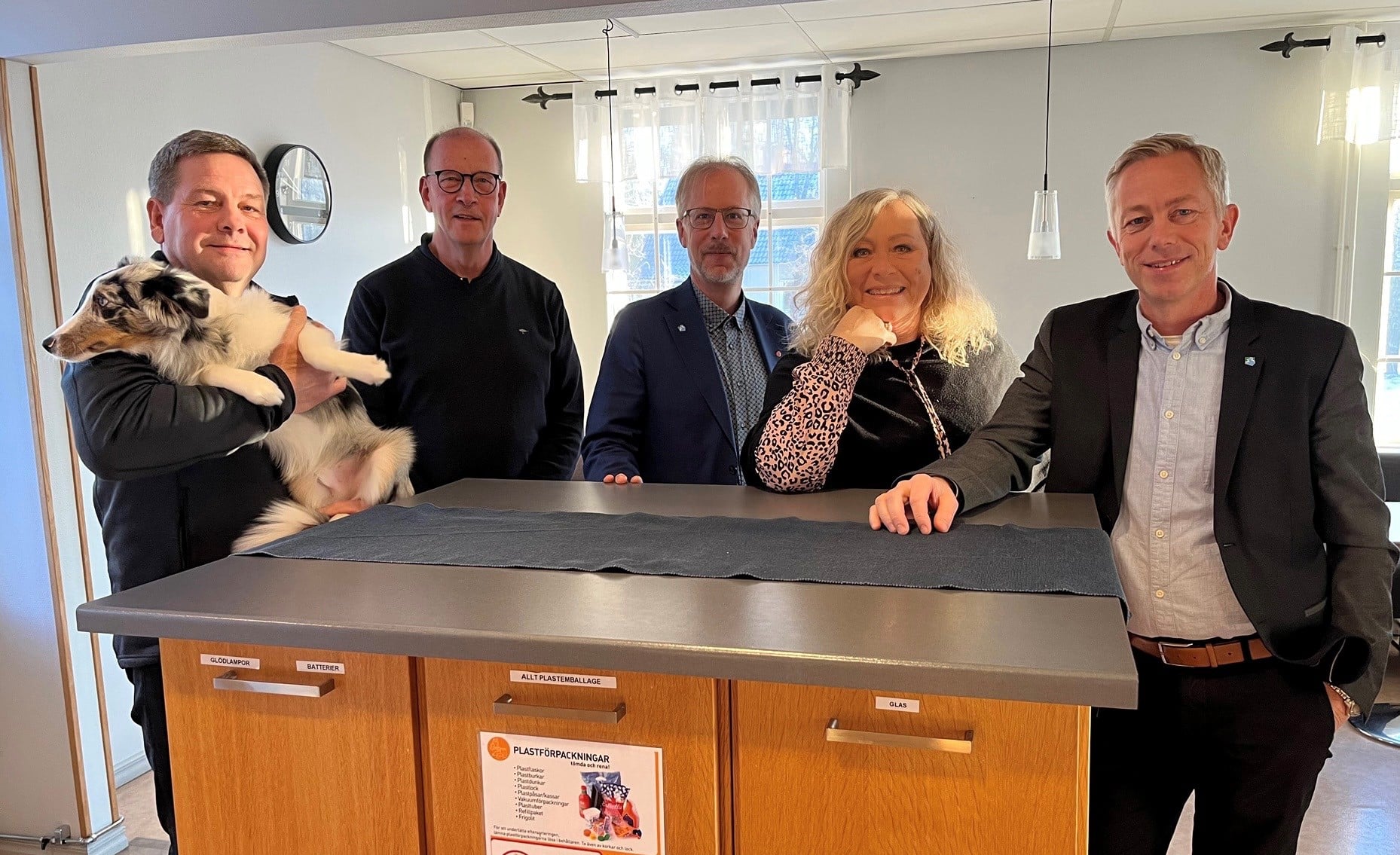 Jan-Erik Eriksson, vovven Sammie, Tommy Nyhlén-Kraftkonsult. Från Munkfors kommun: Mathias Lindquist, Birgitta Svensson och Björn Svantesson (bakom kameran Urban Karlsson som också medverkade på besöket)