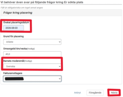 11. Besvara övriga frågor. Här är det viktigt att ange ”Ja” om ansökan gäller en delad placering, det vill säga vårdnadshavare som lever i olika hushåll. Välj ”Ja” om barnet redan har en placering på den sökta förskolan/fritidshemmet. Klicka på nästa.