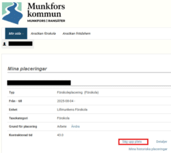 3. Här ser du en sammanställning av dina placeringar för barnet. Välj aktuell placering och klicka på ”Säg upp plats”.